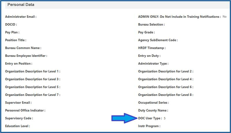 You can also confirm this by clicking on the user's name after locating their account in the CLC. Locate the section titled Personal Data, click the drop-down arrow, and check their DOC User Type. Administrators will have the '5' value in this field.