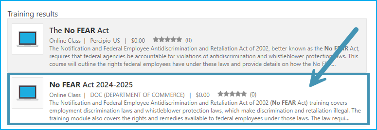 This training is not to be confused with the Percipio 'The No FEAR Act' course that users may see when they search for the training, as seen in the screenshot below.
